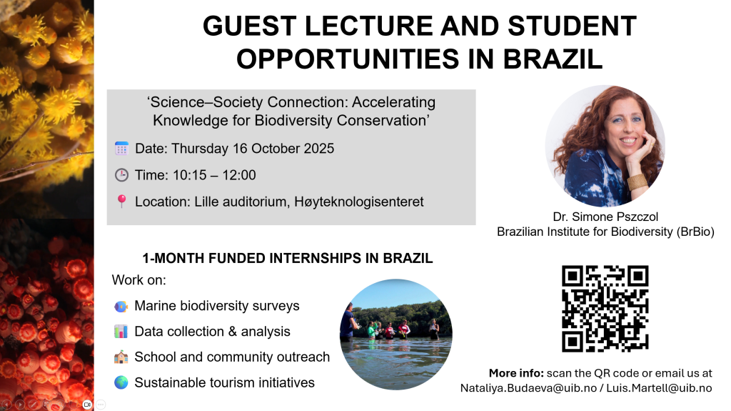 Do you study (marine) biology at the University of Bergen? Are you interested in a 1-month funded internship in Brazil, working with hands-on research, environmental education, and community outreach? Read on, and attend the talk on Thursday October 16th 10:15-12:00 at Lille Auditorium, Høyteknologisenteret.