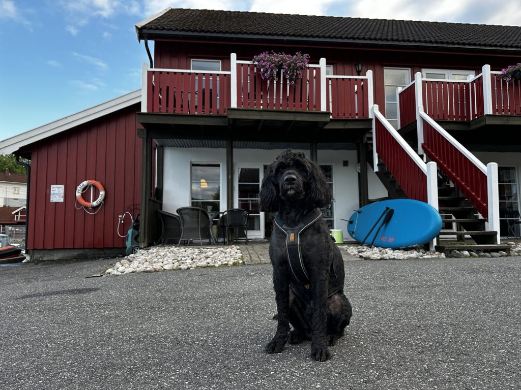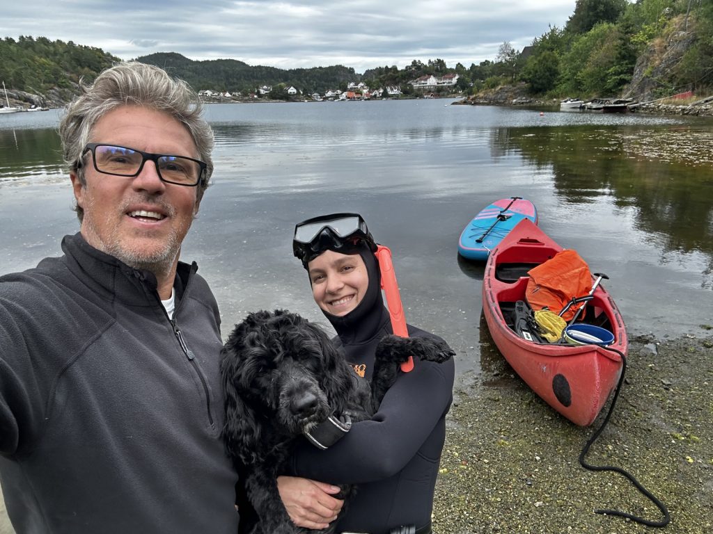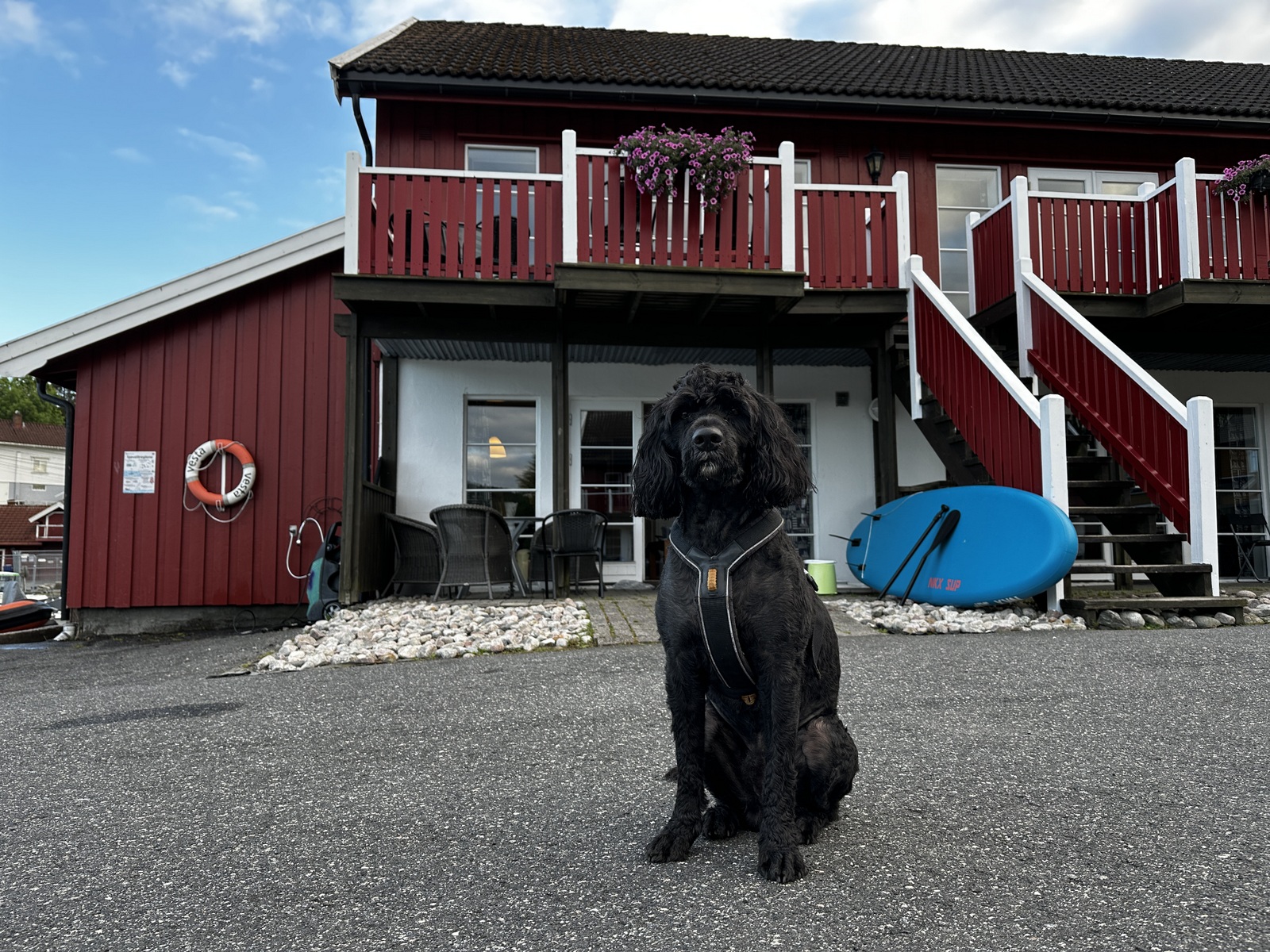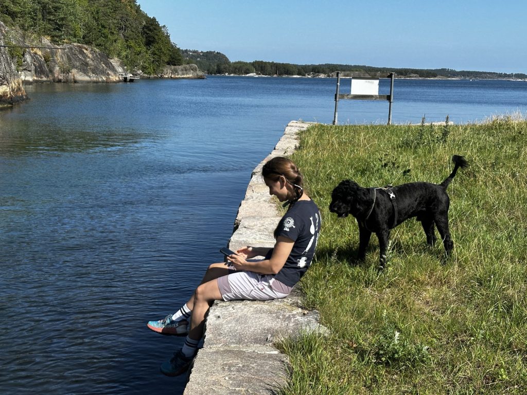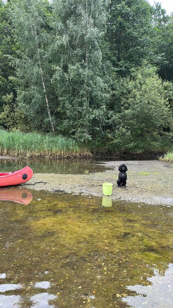 On the SUP board in search of Haminoea navicula. Photo: MM, UiBGroup selfie of team snail including furry mascot Max! Photo: MM, UiBMax safeguarding our equipment in the pollen of our fist sampling day. Photo: MM, UiB