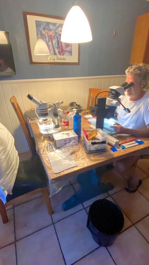 Inside the apartment, we converted the dinner table into our workstation, equipped with microscopes and tools.