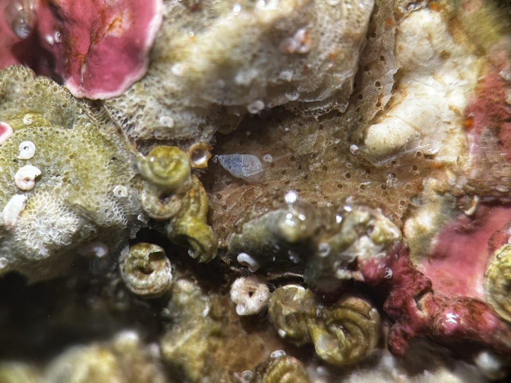 Narrow channel with strong current; a good indicator of snail diversityCessa snorkelling with dive flag due to boat traffic. Photos: MM, UiBRubble overgrown with coralline algae (red) and serpulid worms (round structures), often home to pyramidellid snails. Photo: CR & MM, UiB